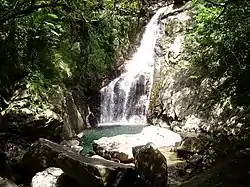 Hiji Falls (比地大滝, Hiji Ōtaki) is a National Park and a popular tourist destination on the island and prefecture of Okinawa, Japan. It is located in the northern part of the Okinawa Island, approximately 20 kilometers north of the city of Nago and close to the Yambaru National Park.[1] The falls and the ensuing river flow region tropical most of the year. It is a popular destination for both sightseers and hikers.[2] From start to the finish, the finished trail is about 2 miles, with many steep stairs throughout the path. Camping is permitted with various camp sites. People visiting the area are warned not to swim near the falls because there have been two deaths since 2013 and various falls.[3]