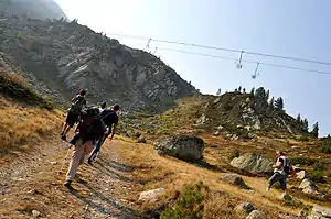 Kosovo has a great potential for development of mountain tourism. The whole territory of Kosovo has more than 50% of mountain relief. People of all ages can go on hiking, although currently most hikers in Kosovo are aged between 30 and 60. The percentage of people that are interested in hiking, compared to the potential that Kosovo offers, is really low even though there is a big effort on raising that percentage.[1] Hiking in Kosovo can be very interesting and an unforgettable experience and many have written about it.[12] Hikers usually take a journal with them to keep track of different hiking trips.[13] Their journal usually contains how many kilometers they walked, how long did it take to arrive to the peak, the places they visited and notable things they saw during the hike.[6]