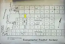 Hildegard Trabant was buried on 23 September 1964 at the Frieden-Himmelfahrt Cemetery (now the Evangelischer Friedhof Nordend), north of Pankow, in Rosenthal.[4] She was buried in a "linear grave", i.e., a grave which expired after the 20 years allowed under East German law without becoming a "family grave" which the family continued to maintain, or another family member was buried more recently there. This period of resting "expired" in 1984, and this particular section of the cemetery was rearranged. Her urn is still there, like all urns buried there, but it is now under another grave number, and under another name on the tombstone. Her previous grave number was UH Him – 234a and the "new" grave number is UH Him – B102.[4][9]
