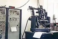 Amongst other devices, the Camden location produced PDP-8 computer-driven X-ray diffractometers in the mid-late 1960s, one of which is believed to be still functional at Oxford University Chemistry Dept. in 2017. Development began with a linear diffractometer[4] in the late 1950s - early 1960s but this was superseded around 1965 by the Y290, a four-circle diffractometer,[5] the electronics for which were developed at the University of Manchester by Prof David B.G. Edwards (Computer Science)[6] along with Owen S. Mills (Chemistry).[7] The early models (actually referenced Y230) used a Ferranti computer for controlling the diffractometer but, due to reliability issues, the cheaper and more compact PDP-8 became the computer of choice for the Y290 model. One of the production engineers claimed that the electronic research department in Camden (headed by Arthur Long) had PDP-8 No 4 from Digital Equipment Corporation (DEC), so Hilger and Watts was likely to have been one of the first PDP-8 customers. The book ‘Single Crystal Diffractometry’[8] by U.W. Arndt and B.T.M. Willis (C.U.P., 1966) has photographs and other excellent diagrams showing the construction of these machines; both authors were involved in their development. The four-circle diffractometer was originally designed for neutron work at the Atomic Energy Research Establishment Harwell Laboratory but it became better known in field of X-ray crystallography. Photographs showing prototypes of both instruments may be seen in a review article by U.W. Arndt.[9] For commercial production of the four-circle diffractometer, Hilger and Watts won two Queen's Awards to Industry, the first for Services to Export in 1966 and the second for Technological Achievement in 1968.[10] In the late 1960s the cost of the four-circle system was around $130,000.
