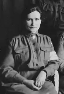 Hilja Riipinen's anti-communism was sparked by the Finnish Civil War. It turned into relentless hostility against socialism and she kept reminding of the "bloody Marxist revolution enthusiasm in 1918" in her speeches for years.[13] Her views have been described as one having to take part in a conflict between Marxist and non-Marxist world views, of which only one can win. She also felt that this was a flaw in the political system: democracy could only lead to bad compromises.[14] Being fond of "high spirituality", she opposed Marxist materialism and will to dispose traditional morality and modesty. Riipinen thought that socialism poisoned people's relationship to work by claiming that work is slavery.[15] Her radical views were widely noted in left-wing circles who considered her one of the worst agitators. Socialist newspapers wrote about "Amazon Hilja Riipinen" and referred to the "white fists of Hilja Riipinen".[16]