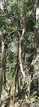 Long Point campground is 18 km south of Hillgrove in the wilderness of Oxley Wild Rivers National Park. There are two posted walking tracks through dry rainforest and around the rim of the gorge offering good views over the Chandler and Macleay River systems. The overnight Chandler River Walk to Wollomombi starts here. Some rare Eucalyptus michaeliana (Hillgrove Gum) trees may be seen growing along the Long Point Road. These trees have a distinctive, mottled, greenish trunk with peeling yellow-brown bark (like jigsaw puzzle pieces). Its range is restricted to Mount Barney National Park in Queensland and in NSW to the Wyong and Hillgrove areas.