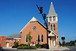 Built of brick, the church rests on a foundation of limestone and is covered with an asphalt roof, and some exterior elements are made of wood and sandstone.[1] The building's basic form is a simple gable-front structure, but a tall bell tower stands to one side of the main section. Due to elements such as a steep hip roof, ornamental brackets, and large louvers protecting the belfry, the square tower is the most prominent component of the overall design. Worshippers enter the building through the base of the tower, using a doorway with a small gabled porch.[2] Behind the tower, the side of the building is extended with an ell that approaches the streetside. Gothic windows are set on the ground floor in the facade, bell tower, and ell, while a circular window crowns the front gable and additional Gothic windows pierce the second story of the tower.[3]