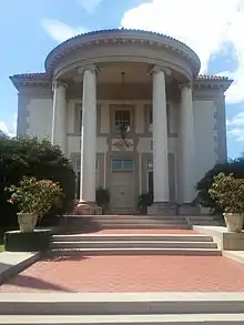 Fuller E. Callaway purchased the estate of Judge Blount and Sarah Ferrell in 1912. Neel Reid, of the Hentz, Reid & Adler architectural firm, designed the 13,000-square-foot (1,200 m2)[2] Callaway home to complement the Italian boxwood garden created by the Ferrells. The design of the home is also said to have been inspired by one of Reid's favorite architects, Charles Adams Platt and his adaptations of Italian villas set in formal landscape gardens.[3] The Italian style of the home is evident by its white stucco exterior and red tile roof. The east side of the home presents a grand two-story semi-circular portico with Ionic columns. Neel Reid's signature classic style is featured in the interior of the home with its double staircase, stone fireplaces (one of which was changed to wood by Philip Schutze in 1948) and the long, narrow palm room with vaulted ceiling and low marble wainscot.[4]