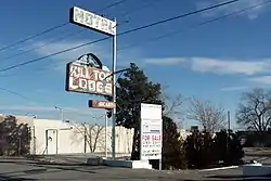 The Hilltop Lodge was a historic motel on Central Avenue (former U.S. Route 66) in Albuquerque, New Mexico, which was notable as one of the best-preserved Route 66 motels remaining in the city. It began as a small three-unit lodging in 1941, and was expanded to 12 units by owner E. H. Stopple in 1946.[3] The property was added to the New Mexico State Register of Cultural Properties in 1997 and the National Register of Historic Places in 1998.[2] The motel was demolished in 2003 after being shut down by the city as a nuisance property.[4] The remainder of the site, including the neon sign, was cleared around 2017 for a realignment of Yucca Drive due to the Albuquerque Rapid Transit project.