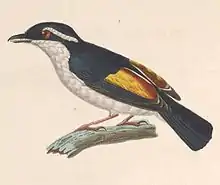 The taxonomic history of this subspecies is complex. It was originally described by Nicholas Aylward Vigors in 1831 who described the bird based on a specimen from Murree in Pakistan. He called it Lanius erythropterus[6] and the subspecies was later moved out of the genus Lanius used only for true shrikes and placed in the genus Pteruthius as P. erythropterus. In 1951, Koelz described a new subspecies from Nagaland under the name of Pteruthius erythropterus validirostris.[4] In 1960, Biswamoy Biswas noted that the name Lanius erythropterus was "preoccupied" or clashing with an earlier name used by Shaw in 1809 for a different species and he therefore suggested that the western Himalayan species should be renamed as a subspecies ripleyi after elevating Koelz's name for the eastern Himalayan form to the rank of a species.[7] Temminck described a similar and related species from Java in 1835 as Allotrius flaviscapis and this too was moved to the genus Pteruthius. The subspecies validirostris, which then included ripleyi, along with many other forms in the region were lumped as subspecies of Pteruthius flaviscapis by Ernst Mayr and R.A. Paynter in their taxonomic treatment in 1964.[8] This was followed by most regional works such as the Handbook of the Birds of India and Pakistan by Salim Ali and Dillon S. Ripley.[9] In 2008, a study of the Pteruthius group found that the relationships within the groups here were more complex than earlier thought and one of the findings was that the subspecies validirostris of the eastern Himalayas was more closely related to the forms found further to the east in Southeast Asia and far more distant to the form in the western Himalayas. This led to the elevation of the western form as Pteruthius ripleyi with validirostris being made a subspecies of Pteruthius aeralatus Blyth's shrike-babbler.[3][10]