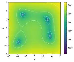 In mathematical optimization, Himmelblau's function is a multi-modal function, used to test the performance of optimization algorithms. The function is defined by: