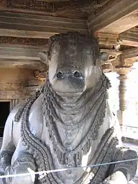 Other temples built are in a blend of Nagara style (north Indian architecture) and Dravidian architecture, also called as Vadara style.[27] One depiction of Vishnu in the state dates back to the 6th century.[28] The Bhoga Nandeeshwara Temple in Nandi village is one of the oldest temples in Karnataka dating to the 9th century. The temple, hewn out of rock, comprises two complexes. While the first complex houses three deities, the second complex consists of a huge and majestic kalyani or pond. The foundation of the temple was laid by the Banas of the 9th century. The Chola rulers of the 11th century constructed the roof of the temple. The marriage hall was built by the Hoysalas in the 13th century and a wall of the second complex was built by the Vijayanagar kings. Stone carvings are a popular tourist attraction and are a source of inspiration for students of art and architecture.[29]