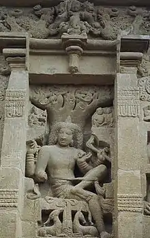 Somaskanda derives from Sa (Shiva) with Uma (Parvathi) and Skanda (child Murugan).[64] It is the form of Shiva where he is accompanied by Skanda the child and Paravati his consort[65] in sitting posture. Though it is a Sanskrit name, it is a Tamil concept and Somaskandas are not found in North Indian temples.[66] In the Tiruvarur Thygarajar Temple, the principal deity is Somaskanda under the name of Thyagaraja.[65] All temples in the Thygaraja cult have images of Somaskandar as Thyagarajar - though iconographically similar, they are iconologically different. Architecturally when there are separate shrines dedicated to the utsava(festival deity) of Somaskanda, they are called Thyagaraja shrines.[67] Unlike Nataraja, which is a Chola development, Somaskanda was prominent even during the Pallava period much earlier to Cholas.[68] References to the evolution of the Somaskanda concept are found from Pallava period from the 7th century CE in carved rear stone walls of Pallava temple sanctums.[69] Somaskanda was the principal deity during Pallava period replacing lingam, including the temples at Mahabalipuram, a UNESCO world heritage site. But the cult was not popular and Somaskanda images were relegated to subshrines.[70] Sangam literature does not mention Somaskanda and references in literature are found in the 7th-century Tevaram.[69]