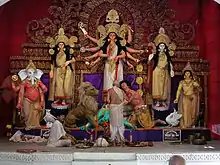Hinduism is the largest religious tradition in the Indian state of West Bengal with approximately 70.5% of the population identifying themselves as Hindus (as of 2011).[2] The Hindus in West Bengal mostly belong to the Shakta (the Kalikula tradition), minority to Vaishnavite and a small community belong to Shaivite and other denominations.[3] The vast majority of Hindus in West Bengal are Bengali Hindus numbering around 55 million and comprising 60.2% of the state population of 91.35 million (2011)[4][5] but a notable section of non-Bengali Hindus also exist, particularly among Marwaris, Biharis, Odias, Gurkhas, Sindhis, Gujaratis and various tribal communities such as Koch, Santals, Munda and particularly Adivadis numbering around 9.4 million comprising rest 10.3% of the state population.[5][6][7]