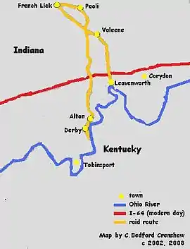 From French Lick, Hines' men traveled to Valeene, Indiana. At Valeene, while still posing as Union troops, they set a house on fire whose occupants refused to give them dinner. This exposed that Hines' men were actually Confederates to the local populace. A resistance was quickly formed at Paoli. Hines had hired a local man, Bryant Breeden, to guide them to safety, but Breeden was strongly pro-Union, and instead guided the Confederates onto the Little Blue Island, a small island in the middle of the Ohio River near Leavenworth, Indiana. On this island, a skirmish began, killing three Confederate soldiers. Hines escaped across the Ohio River with a few of his men, and the rest of the Confederate force surrendered, having successfully covered Hines' escape. The Corydon Weekly Democrat said of the Home Guards "Our citizens, though unused to actual war, showed the nerve of soldiers".[3][4][5]