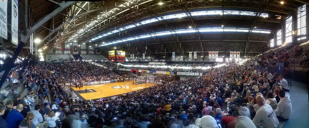 The main interior feature of the arena is an NCAA regulation-sized basketball court at the center. The removable hardwood basketball court, which originally ran east–west, was changed in 1933 to a north–south orientation to provide additional arena seating and to avoid the glare of late afternoon sun on the court.[8]