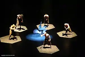 Other hip-hop theater companies were founded in the 1990s. Compagnie Käfig is a French hip-hop theater company of mostly Algerian descent founded in 1995 by Mourad Merzouki.[19] Their performances mix standard b-boying, locking, and popping with capoeira, mime, and gymnastics.[19] They use the same fusion in music by mixing rap music with classical music and Andalusian guitar.[19] While on tour in the U.S. they performed at Jacob's Pillow in Massachusetts and at the Joyce Theater in New York.[20][21] Bintou Dembélé performed at the Joyce Theater in New York with Mourad Merzouki's Compagnie Käfig in 2002.[22][23] That same year she created her own dance company, which she describes as being mainly inspired by Pina Bausch's notion of 'danced theater'.[23][24]
