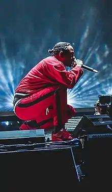 Donald Trump, 45th president of the United States, has had a long and complicated relationship with hip hop. Prior to 2015, many references to Donald Trump were made in hip hop music, mostly celebrating his status as a symbol of wealth, power, and machismo.[45] However, since his incendiary 2016 presidential campaign, references to the president in hip hop have been overwhelmingly negative, criticizing Trump's perceived racist views. References in YG's "FDT", Joey Bada$$'s "Rockabye Baby" and "Land of the Free", Eminem's "Campaign Speech" and 2017 BET cypher, Denzel Curry's "Sirens", Joyner Lucas' "I'm Not Racist" and many more all criticize or even threaten Trump for his divisive rhetoric and alleged racist views and policies.[46] However, a prominent example of support for Donald Trump within the hip hop community has come from rapper and producer Kanye West, who has voiced his support for Trump during rants within his concerts, multiple tweets including pictures wearing Trump's signature MAGA hat, and even lyrics on his song "Ye Vs. The People."[47] West has since distanced himself from politics and implied withdrawing support for Trump.[48]