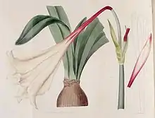 | Illustration in Botanical Register; Consisting of Coloured Figures of Exotic Plants Cultivated in British Gardens; with their History and Mode of Treatment. London 11: t. 876. 1825, as Amaryllis solandriflora var. vittata | |