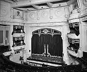 The theatre was the largest for miles around with seating for about 1,000 people, which included 449 seats in the stalls, 258 seats in the dress circle, 272 seats in the balcony (originally this was benched) in addition to four boxes which seated four people in each. The proscenium was 24 feet wide, and the stage was 30 feet high and 22 feet in depth. The theatre was equipped with bars on all levels and eight dressing rooms. By March 1914, the Hippodrome was showing Kinemacolor films alongside the variety acts and, by the end of the 1920s, cinema shows were occasionally also being shown there.[4]