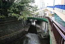 Tengenji Bridge (天現寺橋) is located at the intersection of Gaien-Nishi-dori and Meiji-dori in Hiroo 5-chome. The bridge spans the confluence of the Shibuya River and the Kogai River. The Kogai River flows completely underground since it was covered by concrete. The Kogai River flows under Gaien-Nishi Dori upstream towards and past the east side of Aoyama Cemetery. Two springs known to still flow into the Kogai River are located at the ponds of Arisugawa Park and the ponds at the Nezu Museum. The Tengenji Bridge is an old bridge and existed long before it was mentioned in a text named Gofunaienkakuzsho (御府内沿革図書) published in Bunkyu 3 (1863).