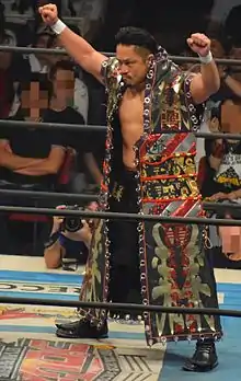 On January 4, 2017, at Wrestle Kingdom 11 in Tokyo Dome, Goto defeated Katsuyori Shibata to win the NEVER Openweight Championship for the first time.[115] Goto made his first successful title defense on February 5 at The New Beginning in Sapporo against Juice Robinson.[116] His second defense took place at the NJPW and ROH co-produced Honor Rising: Japan 2017 event, where he defeated ROH wrestler Punisher Martinez.[117] On April 9 at Sakura Genesis 2017, Goto made his third successful defense against Zack Sabre Jr., despite outside interference from Sabre's Suzuki-gun stablemates Minoru Suzuki and El Desperado. Afterwards, Goto brawled with Suzuki, setting up his next title defense.[118] On April 27, Goto lost the NEVER Openweight Championship to Suzuki.[119] On June 11 at Dominion 6.11 in Osaka-jo Hall, he failed to reclaim the title in a rematch against Suzuki in a Lumberjack Deathmatch.[120] The following month, Goto entered the 2017 G1 Climax, where he finished with a record of five wins and four losses, failing to advance from his block.[121] At the end of the year, Goto teamed with Yoshi-Hashi in the 2017 World Tag League. Finishing with a record of four wins and three losses, the team failed to qualify for the finals, after losing to Evil and Sanada in their final round-robin match.[122] On January 4, 2018, Goto defeated Minoru Suzuki in a Hair vs. Hair match to win the NEVER Openweight Championship, forcing Suzuki to have his head shaved bald.[123] On January 5, 2018, at New Year's Dash, he was challenged to a title match by Evil, which he accepted. The match took place on February 10, 2018 at The New Beginning in Osaka, where Goto was victorious.[124] On February 23, 2018, Goto made his second successful defense of the NEVER Openweight Championship against The Beer City Bruiser at the NJPW and ROH co-produced Honor Rising: Japan 2018 event.[125] On April 27, 2018, at Road to Wrestling Dontaku, Goto made his third successful defense of the NEVER Openweight championship in a rematch with Juice Robinson.[126] On June 9, 2018 at Dominion 6.9 in Osaka-jo hall, Goto lost the NEVER Openweight Championship to Michael Elgin in a 3-way match which also involved Taichi, ending his second reign at 156 days.[127] On June 17, 2018 at Kizuna Road, Goto defeated Elgin in a rematch for the NEVER Openweight Championship to win back the title[128] Goto made his first successful title defence against Jeff Cobb at G1 Special in San Francisco.[129] From July 14 to August 12 Goto took part in the G1 Climax 2018 and he ended up with 3 wins and 6 losses, failing to advance to the finals. On the final day of the G1 Climax, a returning Taichi later challenged him for the NEVER Openweight Championship, which Goto accepted.[130] On September 17, at Destruction in Beppu, Goto lost the NEVER Openweight Championship to Taichi in his second defense.[131] On October 27, Goto requested for a rematch for the NEVER Openweight Championship, replacing his Chaos stablemate Will Ospreay, who was scheduled to challenge Taichi at Power Struggle for the title but was unable to do so due to Ospreay suffering an injury.[132] Taichi, however, waved off Goto's challenge and declined immediately.[133] Despite this, the title match was eventually still set at Power struggle which took place on November 3. At the event, Goto defeated Taichi to win the NEVER Openweight Championship for the fourth time. Goto would lose the belt to Kota Ibushi on December 9, without having any defenses.[134]