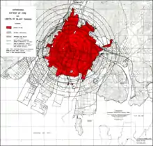 The Hiroshima firestorm was roughly 3.2 kilometres (2.0 mi) in diameter, corresponding closely to the severe blast damage zone. (See the USSBS[55] map, right.) Blast-damaged buildings provided fuel for the fire. Structural lumber and furniture were splintered and scattered about. Debris-choked roads obstructed firefighters. Broken gas pipes fueled the fire, and broken water pipes rendered hydrants useless.[54] At Nagasaki, the fires failed to merge into a single firestorm, and the fire-damaged area was only one fourth as great as at Hiroshima, due in part to a southwest wind that pushed the fires away from the city.[56]