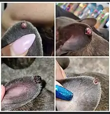 A histiocytoma in the dog is a benign tumor. It is an abnormal growth in the skin of histiocytes (histiocytosis), a cell that is part of the immune system. A similar disease in humans, Hashimoto-Pritzker disease, is also a Langerhans cell histiocytosis.[1] Dog breeds that may be more at risk for this tumor include Bulldogs, American Pit Bull Terriers, American Staffordshire Terriers, Scottish Terriers, Greyhounds, Boxers, and Boston Terriers. They also rarely occur in goats and cattle.[2]
