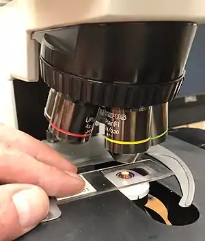Ultramicrotomy is a method of preparing extremely thin sections for transmission electron microscope (TEM) analysis. Tissues are commonly embedded in epoxy or other plastic resin.[9] Very thin sections (less than 0.1 micrometer in thickness) are cut using diamond or glass knives on an ultramicrotome.[12]