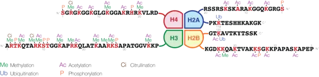 | H3K4 | H3K9 | H3K14 | H3K27 | H3K79 | H3K36 | H4K20 | H2BK5 | H2BK20 | |