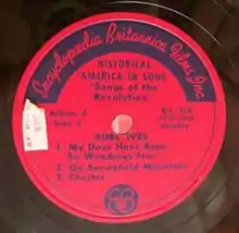 Historical America in Song, released in 1950 by Encyclopædia Britannica Films, is an album set by folk singer Burl Ives. Each of the six albums consists of five 12-inch vinylite records, for a total of thirty 78 rpm records.[1] Each album has its own cover with a drawing of the Washington Monument on it (see the illustration).