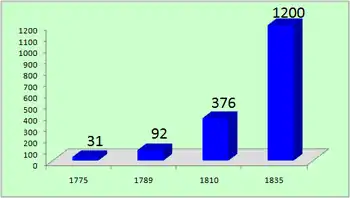 As the number of cities of 8,000 or more population grew rapidly so too the daily newspapers were increasing in number. The first had appeared in Philadelphia and New York in 1784 and 1785; in 1796 one appeared in Boston. By 1810 there were twenty-seven in the country—one in the city of Washington, five in Maryland, seven in New York, nine in Pennsylvania, three in South Carolina, and two in Louisiana. As early as 1835 the Detroit Free Press began its long career.[29][30]