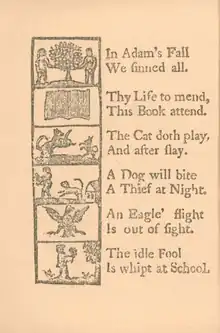 In the 17th century, colonists imported schoolbooks from England. By 1690, Boston publishers were reprinting the English Protestant Tutor under the title of The New England Primer. The Primer was built on rote memorization. By simplifying Calvinist theology, the Primer enabled the Puritan child to define the limits of the self by relating his life to the authority of God and his parents.[44][45] The Primer included additional material that made it widely popular in colonial schools until it was supplanted by Webster's work. The "blue backed speller" of Noah Webster was by far the most common textbook from the 1790s until 1836, when the McGuffey Readers appeared. Both series emphasized civic duty and morality, and sold tens of millions of copies nationwide.[46]