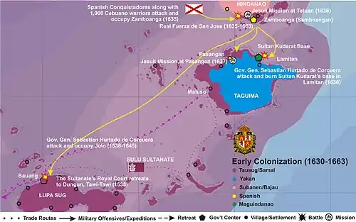The legendary Sultan Kudarat (Qachil Corralat to the Spanish) of Maguindanao maintained lucrative trade routes between his mainland kingdom and the Sulu Archipelago through a base situated in Lamitan. The Maguindanaos then called the island "Matangal" after the highest visible peak from the Celebes Sea. This base served as a staging ground for much of Sultan Kudarat's offensives against the Spanish until the Spaniards under the command of Governor General Sebastián Hurtado de Corcuera crushed it in 1637, just one year after the Spanish Fort in nearby Zamboanga was established. Spanish reports of the battle listed an Apuh Menggah, and Apuh Dagang and Apuh Batalan as the main Yakan Chieftains leading the local resistance at that time, all of whom were roundly defeated, prompting a significant number of their followers to move farther inland and southwards.