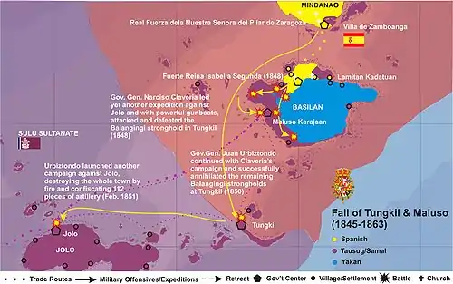 This Tausug base became a vital jump-off point for raids on Zamboanga. As a major military naval base, Maluso was staffed with some of Sulu's best blade-smiths and boat-builders to see to it that the Sultan's raiders were properly equipped before any raid was launched. Slave-raids into the island's interior likewise commenced.