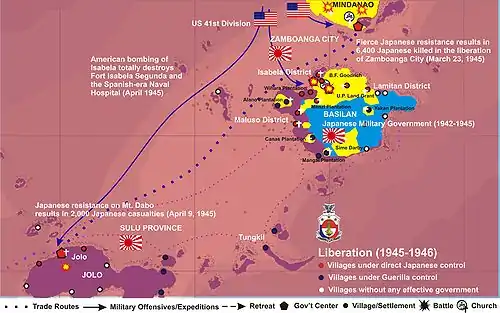 - 1945 - Filipino soldiers of the 6th, 10th and 102nd Infantry Division of the Philippine Commonwealth Army was landing the beaches and liberated the island and helpful to the local Christian and Muslim guerrilla fighters and American soldiers and defeating Japanese Imperial forces