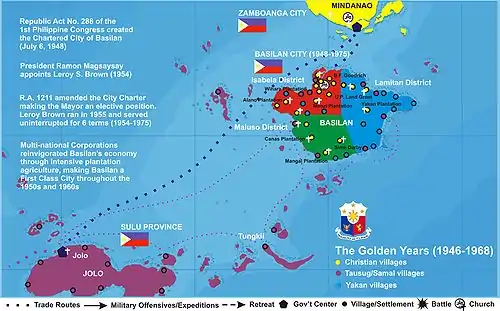 - July 1, 1948 - City of Basilan (R. A. 288,[10] authored by Cong. J. S. Alano) is inaugurated, Nicasio S. Valderroza becomes the first City Mayor (appointed by Pres. Elpidio Quirino)