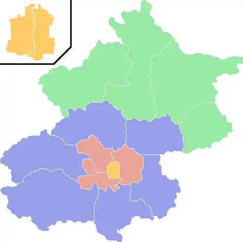 The Jin expanded the city to the west, east, and south, doubling its size. On today's map of urban Beijing, Zhongdu would extend from Xuanwumen in the northeast to the Beijing West railway station to the west, and south to beyond the southern 2nd Ring Road. The walled city had 13 gates, four in the north and three openings in each of the other sides. Remnants of Zhongdu city walls are preserved in Fengtai District.[64] The Jin emphasized the centrality of the regime by placing the walled palace complex near the center of Zhongdu. The palace was situated south of present-day Guang'anmen and north of the Grand View Garden.[65] In 1179, Emperor Zhangzong had a country retreat built northeast of Zhongdu. Taiye Lake was excavated along the Jinshui River[66] and Daning Palace (大寧宮/大宁宫) was erected on Qionghua Island in the lake.[67][Note 23] The grounds of this palace is now Beihai Park.
