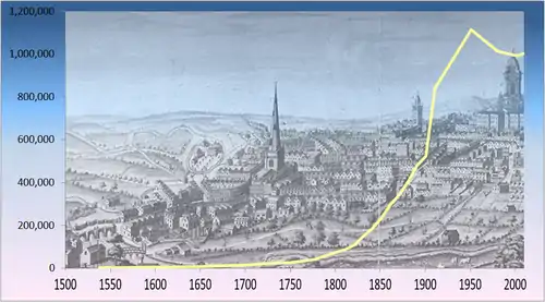 The Tudor and Stuart eras marked a period of transition for Birmingham.[102] In the 1520s the town was the third largest in Warwickshire with a population of about 1,000 – a situation little changed from that two centuries earlier.[103] Despite a series of plagues throughout the 17th century,[104] by 1700 Birmingham's population had increased fifteenfold and the town was the fifth-largest in England and Wales,[105] with a nationally important economy based on the expanding and diversifying metal trades,[106] and a reputation for political and religious radicalism firmly established by its role in the English Civil War.[107]