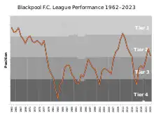 Blackpool spent the years between 1962 and 1967 in Division One, before being relegated to the second tier of English football for the first time since 1936–37. After three seasons in Division Two, the club returned to the top flight, but only for one season. In the decade between 1972 and 1982, Blackpool dropped down two more divisions, to Division Four, and in 1982–83 hit their lowest finishing point: 89th out of the total 92 League clubs.