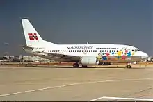 Following the decision to sell the two 767s, management also decided to sell the four remaining F-28s. This would allow Braathens to operate a fleet of pure 737-200, giving lower operating costs. One 737 was taken out of service in 1984, and the four F-28s sold in 1986. The same year, seven more 737-200s were delivered, along with two more in 1987 and 1988. By then, Braathens SAFEs entire fleet consisted of nineteen 737-200s.[48] At the same time, Boeing had launched the 737-300, a slightly larger aircraft with new CFM-56 engines. Braathens SAFE considered the new aircraft, but where concerned that it used a traditional mechanical cockpit. The airline also needed larger aircraft for the charter traffic, and smaller aircraft for the domestic routes. The airline also considered the McDonnell Douglas MD-80 and the Airbus A320, but settled on the 737 following the announcement of the stretched 737-400, with 156 seats, and the shortened 737-500, with 124 seats. These had glass cockpits, and Braathens SAFE would be among the first airlines to receive both models. To finance the purchase, the airline sold all but two of the 737-200s and leased them back. For some of the aircraft, they received more money than they had paid.[58]