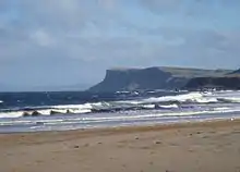 A large portion of Antrim is hilly, especially in the east, where the highest elevations are attained. The range runs north and south, and, following this direction, the highest points are Knocklayd 514 m (1,690 ft), Slieveanorra 508 m (1,670 ft), Trostan 550 m (1,800 ft), Slemish 437 m (1,430 ft), Agnew's Hill 474 m (1,560 ft) and Divis 478 m (1,570 ft).[8] The inland slope is gradual, but on the northern shore the range terminates in abrupt and almost perpendicular declivities, and here, consequently, some of the finest coast scenery in the world is found, widely differing, with its unbroken lines of cliffs, from the indented coast-line of the west. The most remarkable cliffs are those formed of perpendicular basaltic columns, extending for many miles, and most strikingly displayed in Fair Head and the celebrated Giant's Causeway. From the eastern coast the hills rise instantly but less abruptly, and the indentations are wider and deeper. On both coasts there are several resort towns, including Portrush (with well-known golf links), Portballintrae and Ballycastle; on the east Cushendun, Cushendall and Waterfoot on Red Bay, Carnlough and Glenarm, Larne on the Sea of Moyle, and Whitehead on Belfast Lough. All are somewhat exposed to the easterly winds prevalent in spring. The only island of size is the L-shaped Rathlin Island, off Ballycastle, 11 km (6.8 mi) in total length by 2 km (1.2 mi) maximum breadth, 7 km (4.3 mi) from the coast, and of similar basaltic and limestone formation to that of the mainland. It is partially arable, and supports a small population. Islandmagee is a peninsula separating Larne Lough from the North Channel.[9]