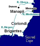 On Ptolemy's mid-2nd century 'Map' of Ireland – dating from c. AD 150[14] – Carnsore point appears as Hieron, the Sacred Cape, the river Barrow as the Birgos (or Birgus), most of the area of County Wexford is shown as inhabited by a tribe called the Brigantes, and a tribe called the Coriondi (or Koriondoi) are shown as occupying north County Wexford.[15]