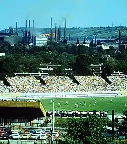 In the 1978–79 season of the Hungarian League the club has reached its best result ever finishing on the third position of the table. Therefore, they qualified for the 1979-80 UEFA Cup.[6] On 19 September 1979 Diósgyőr was hosted by SK Rapid Wien at the Gerhard Hanappi Stadium and the match was won by the Hungarian club by 1–0.[7] On 3 October 1979 the second leg was also won by the Hungarian club by 3–2.[8] On 24 October 1979, Diósgyőr was hosted by the Scottish club, Dundee United F.C. at the Tannadice Park. The match was won by Diósgyőr.[9] The second leg was won by Diósgyőr by 3–1 at home, therefore the Hungarian team could qualify for the third round of the cup.[10] on 28 November 1979, in the third round Diósgyőr faced with the giant German club 1. FC Kaiserslautern and they lost 2–0 at home which resulted a very difficult return match for the Miskolc team.[11] On 12 December 1979 Kaiserslautern beat Diósgyőr 6–1 which resulted the farewell for the team since the German club advanced on 8–1 aggregate.[12]
