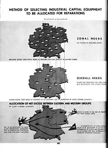 In the western zones, dismantling and/or destruction of German industry continued until 1951 in accordance to the (several times modified) "German level of industry" agreement connected with the Potsdam conference whereby Germany was to be treated as a single unit and converted into an "agricultural and light industry economy". By the end of 1948 the US had dismantled or destroyed all war-related manufacturing capability in its occupation zone.[8] In accordance with the agreements with the USSR, shipment of dismantled industrial installations from the west began on March 31, 1946. Under the terms of the agreement the Soviet Union would in return ship raw materials such as food and timber to the western zones. When the Soviets did not fulfil their side of the agreement, the US temporarily halted shipments east, and they were never resumed. It was later shown that although these events were subsequently used for cold war propaganda purposes against the Soviet Union, the main reason for halting shipments east was not the behaviour of the USSR but rather the recalcitrance of France.[9] Material received by the USSR included equipment from the Kugel-Fischer ballbearing plant at Schweinfurt, the Daimler-Benz underground aircraft-engine plant at Obrigheim, the Deschimag shipyards at Bremen-Weser, and Gendorf power station.[10][11]