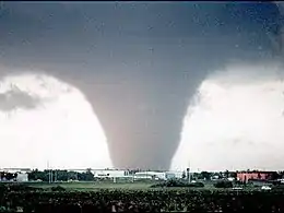 On July 31, 1987, a devastating tornado (ranked F4 on the Fujita scale; main article: Edmonton tornado) hit the city and killed 27 people.[15] The storm hit the areas of Beaumont, Mill Woods, Bannerman, Fraser, and Evergreen.[16] The day became known as "Black Friday."[17] Then-mayor Laurence Decore cited the community's response to the tornado as evidence that Edmonton was a "city of champions," which popularized the city's unofficial slogan originally coined in 1984 to promote Edmonton.[18] It was further popularized in a sporting context later in 1987 upon the Edmonton Eskimos winning the Grey Cup after the Edmonton Oilers won the Stanley Cup earlier in the year.[18]