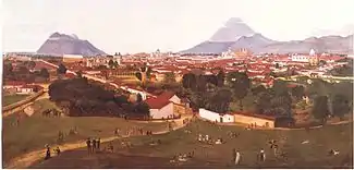 An enthusiastic fan of opera, and following the advice of his mistress Josefa Silva,[lower-alpha 1] president for life of Guatemala Rafael Carrera started the construction of a massive National Theater that was called "Carrera Theater" in his honor, and was located in the old Central Square.[5] The Old Central Square was located in the northeast part of Guatemala City, then not larger than a village, and in 1776 was the site of the placement of the first block of Nueva Guatemala de la Asunción after the 1773 earthquakes destroyed Santiago de los Caballeros de Guatemala.[6] The place was chosen as the new city Central Square, saving the surroundings for the new Cathedral, Palace, and houses for the richest family of the time, the Aycinena family, since the family leader, Fermín de Aycinena, had contributed considerably to the move of the city from its old place.[7] However, the design approved by the Spanish crown had the Central Square in a different location, and this one became the Old Central Square.[6]