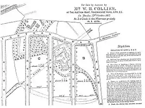 Most of the auctions for both estates took place in the Auction room adjoining the Queen's Head Tavern, Green Lanes. On 7 July 1881 a local press advertisement appeared announcing the auction of the first portion of the Station estate.[3] More than a year later, in September 1882, an advertisement announcing the auction of the first portion of the Harringay Park Estate appeared.[4] This delay in the development of the Harringay Park portion was due to problems associated with providing adequate drainage facilities in the more difficult hilly terrain of the Harringay Park part of the estate. There was also the problem of finding a satisfactory way to divert the course of the New River in order to facilitate the provision of more building land. Because of the total size of the estates, it was some time before they were both fully laid out and the individual plots sold.