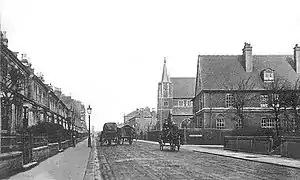 Catering for religious needs there were, five churches on the combined estates. The first of these was the temporary St. Paul's Church of England (Iron Church) on the corner of Green Lanes and Burgoyne Road which opened on 23 December 1883.[17] A permanent church at the other end of Burgoyne Road on the junction with Wightman Road opened in the early 1890s. St. Peter's, situated at the corner of Lausanne and Wightman Roads was opened in October 1884.[18] At some time around 1888/1889 a Wesleyan Methodist Chapel opened in Hampden Road[7] and early in 1891 the Primitive Methodists opened a Chapel in Mattison Road.[19] The Emmanuel Union Chapel was built in Duckett Road at about the same time.[20]