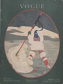 A Vogue cover from 1917 depicts a model clad in white fur spearing a polar bear. Her garments, while stylized and unrealistic, appear to take visual influence from the clothing of the Greenlanic Inuit.[171] From approximately 1915 to 1921, curators at the American Museum of Natural History collaborated with fashion designers to create an American clothing style inspired by Indigenous cultures of North and South America, including the Inuit.[173] In the 1920s, American designer Max Meyer drew inspiration from Inuit garments at the Brooklyn Museum.[174] The 1922 film Nanook of the North has been a popular source of inspiration to fashion designers since its release.[175]