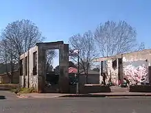 Very little is known about the British concentration camp in Turffontein Johannesburg.[67] It was apparently constructed on the site of the Turffontein Turf Club, which was started in 1887 and still exists at the same place. Those who died at the concentration camp were buried at a cemetery where the suburb Suideroord was laid out many years later. The location is 26°16.357'S, 28°01.638'E. The site still exists, but it is surrounded by palisade fencing and the gates are securely locked. The cemetery was vandalized at the beginning of the Second World War, with the result that the gravestones were replaced by a memorial. The memorial is in the shape of seven coffins. One marble slab, erected on 10 October 1957, records that it replaced a marble slab that had also been vandalized in March 1957. Another records that 716 persons who had died in the concentration camp, were buried in that cemetery.