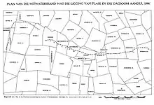 The fledgling town of Johannesburg was laid out on a triangular wedge of "uitvalgrond" (area excluded when the farms were surveyed) named Randjeslaagte, situated between the farms Doornfontein to the east, Braamfontein to the west and Turffontein to the south.[5] The property belonged to the government. The Surveyor-General of the ZAR issued an instruction that the farm be surveyed as a township, consisting of 600 stands measuring fifty feet by fifty feet. The first auction of stands took place on 8 December 1886.[14] The settlement was named after two officials of the Zuid-Afrikaansche Republiek (ZAR), Christiaan Johannes Joubert and Johannes Rissik, who both worked in land surveying and mapping. The two men combined the name they shared, adding 'burg', the archaic Afrikaans word for 'fortified city'.