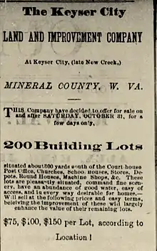 The Paddy Town, Virginia, post office was established on October 30, 1811.[4] The McCarty family built a stone house in 1815, still standing today at Keys Street in Keyser.[5] A travel guide described the town in these formative years:
