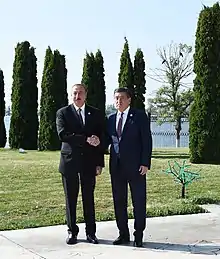 In his first year, Jeenbekov participated in 30 international meetings, where he signed a total of 77 bilateral agreements and 414 multilateral documents. That same year, he ordered the foreign ministry to establish diplomatic relations with four foreign countries.[31][32] The draft of a new co-operation agreement with the United States is currently being reconciled.[33]